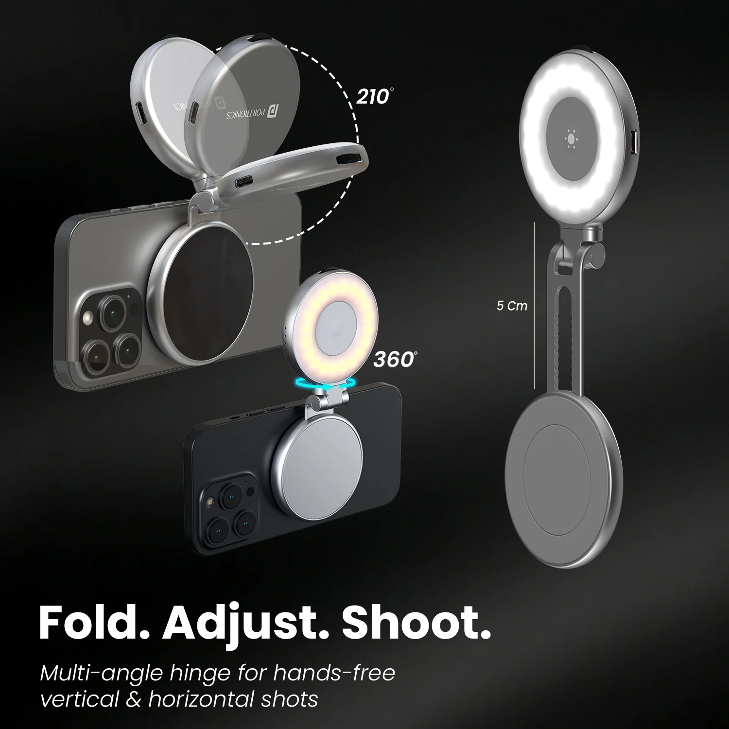 - Multi-Angle Foldable Design – Flexible hinge allows up to 210° fold and 360° rotation for easy switching between vertical and horizontal shots. Works as a handheld light or a stable mobile stand for hands-free use.